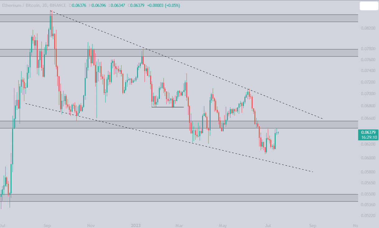 ETH/BTC is attempting to push back above the resistance for the second time after the breakdown. A new low was printed and a higher low at that, which gives some hope to traders, but there are a bunch of resistance zones before I will become bullish.