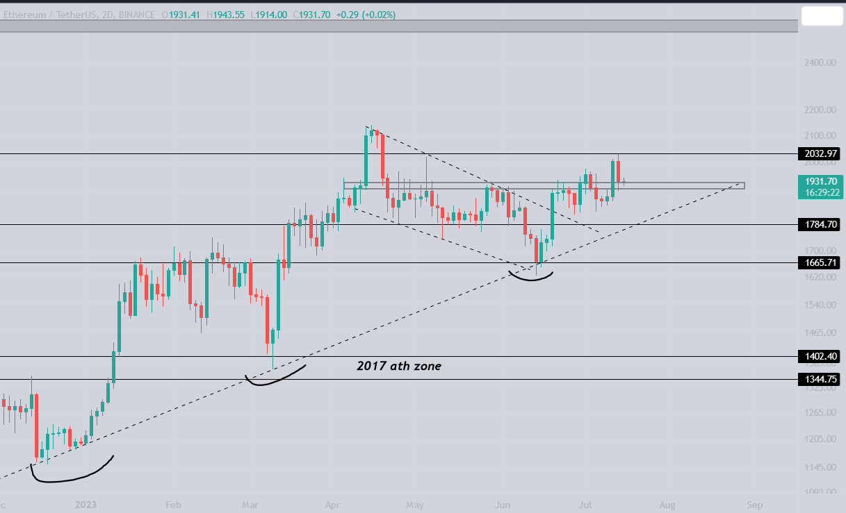 Breaking back down below $1,900 would be a bearish sign, and we would look towards the trendline that sits slightly below $1,800. In my opinion, the levels are clear. Both BTC and Ethereum are trading on the breakout zones but lack strength.