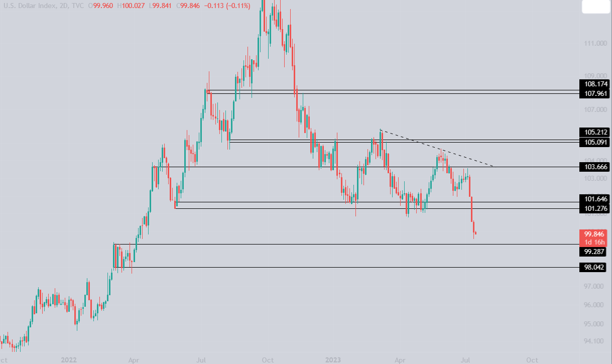 A strong breakdown was seen last week after the CPI event, breaking the crucial 101 level as traders expect the Fed not to hike rates this month.