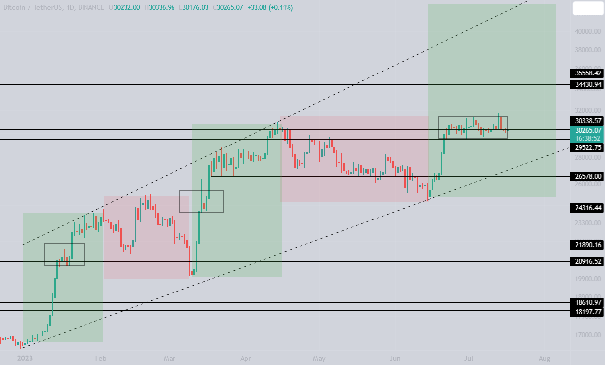 It's been another great week for day traders as there was a clear fake breakout above $31,500. The breakout occurred after news about the SEC and XRP, pushing the market higher. After the fake breakout was confirmed, Bitcoin dropped towards the range low and bounced a bit off $29,900. Apart from being in a range, not much has happened.