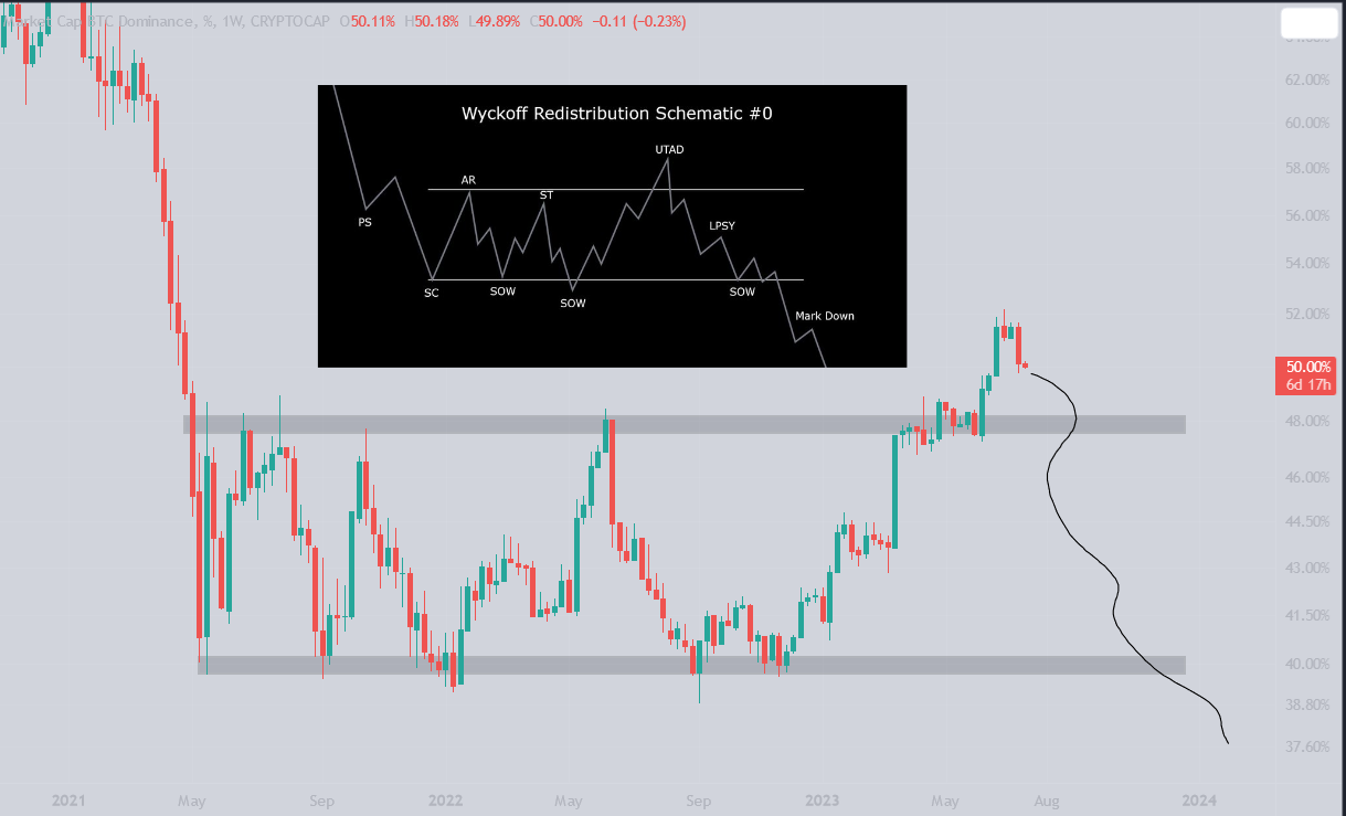 This week, I'm also sharing a Bitcoin Dominance chart that bears a striking resemblance to the Wyckoff redistribution pattern.